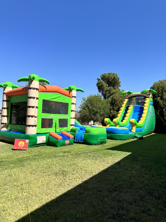This rental includes two inflatable attractions: a waterslide and a bounce house slide combo. It is a great choice for adding variety to an event, giving guests both a fun jumping area and an exciting slide experience. The mix of features makes it a versatile option for parties, family gatherings, school events, and other celebrations where you want more than one inflatable activity in a single rental.